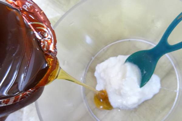 الخطوة الثالثة: أضف معلقة واحدة من العسل علي الزبادي, معلقة واحدة فقط حتي لا يصبح الخليط لزج .